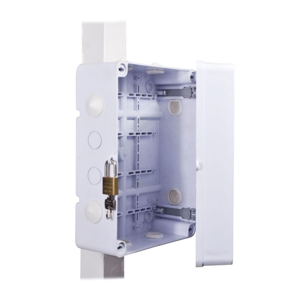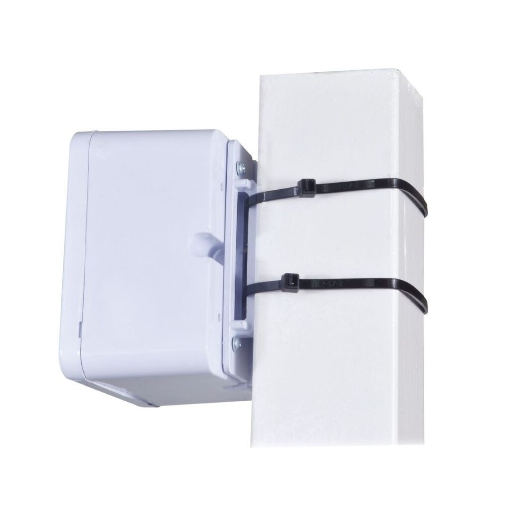 • Suporte que permite fixar a caixa utilizando fitas ou abraçadeiras, facilitando a aplicação em postes e outras finalidades.